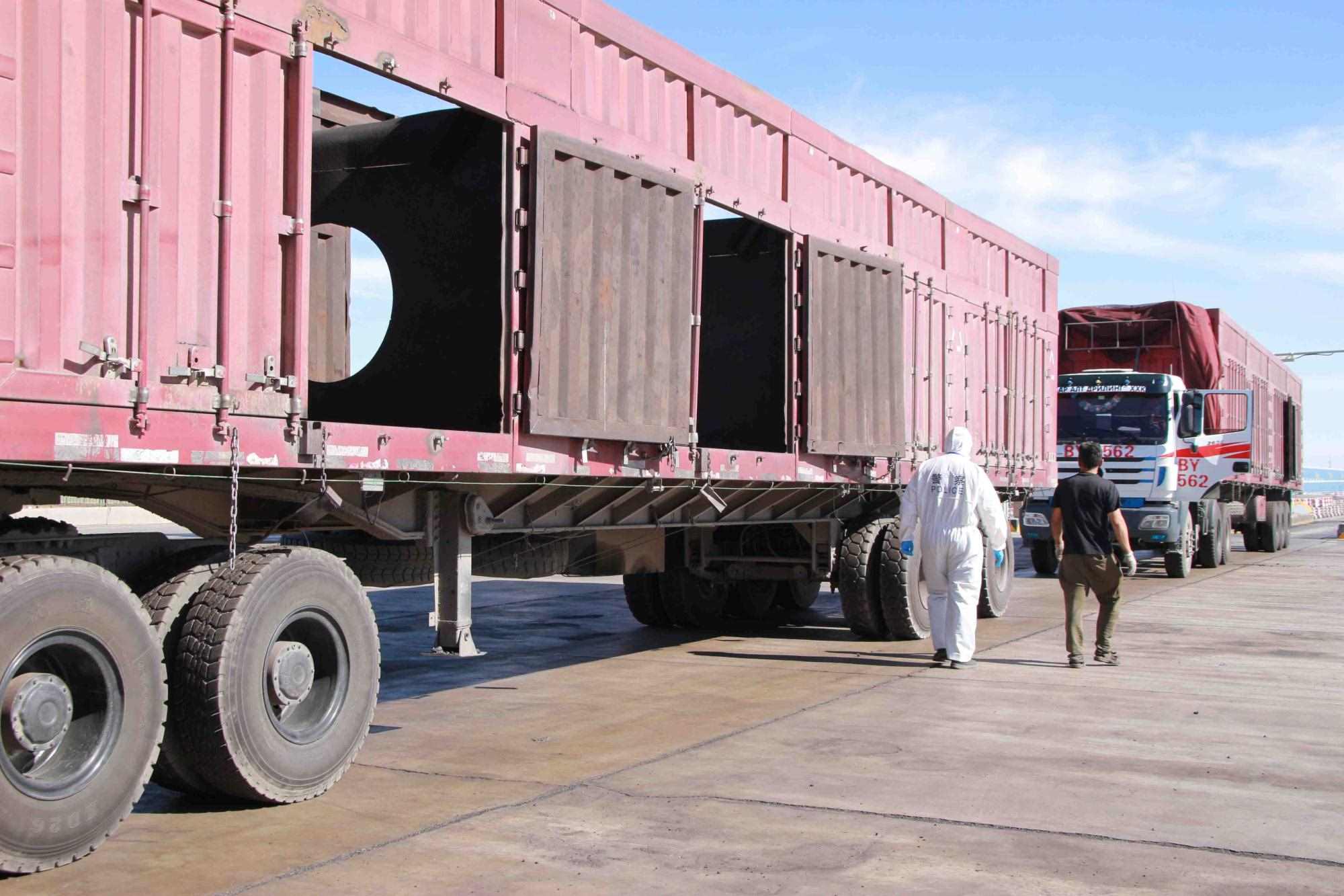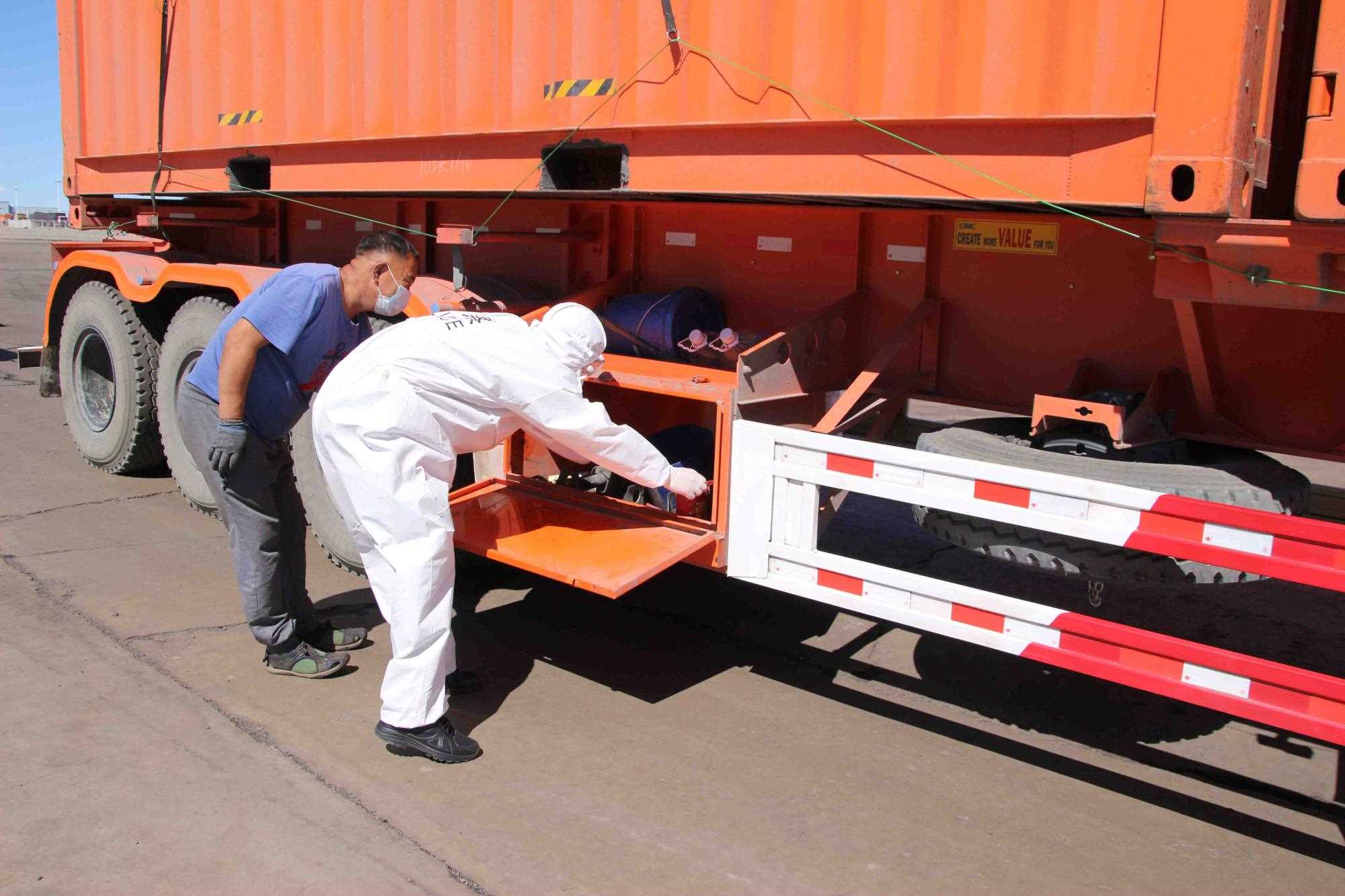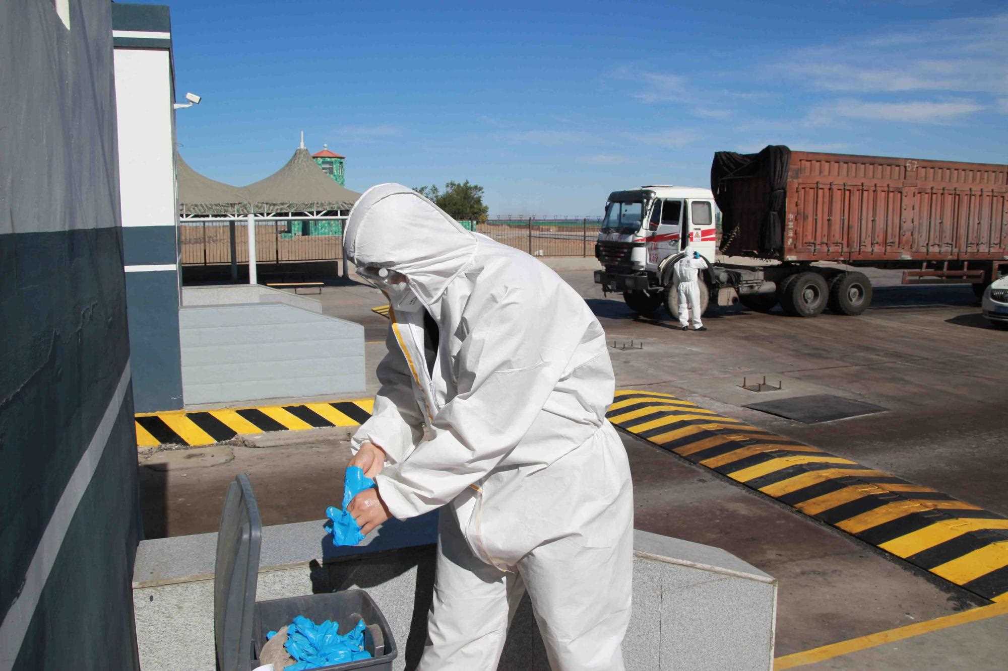 近期策克口岸的溫度持續(xù)增加至30攝氏度以上,而在通行的重型卡車,溫度還要更高,下午15點(diǎn)溫度計地表溫度測量最高可達(dá)40攝氏度。這無疑讓的查驗(yàn)工作更為繁重。更重要的是,由于疫情影響每名民警在查驗(yàn)期間都要穿上防護(hù)服,在高溫下,由于防護(hù)服是密閉的,防護(hù)服里仿佛成了蒸箱,用不了十分鐘,民警就會汗流浹背,防護(hù)服黏在身上又粘又癢,一班勤務(wù)近2個小時,必須要等過了勤務(wù)才能休息,而民警還要完成車體的查驗(yàn)工作,包括工具箱、馬槽等處,絲毫不敢馬虎。