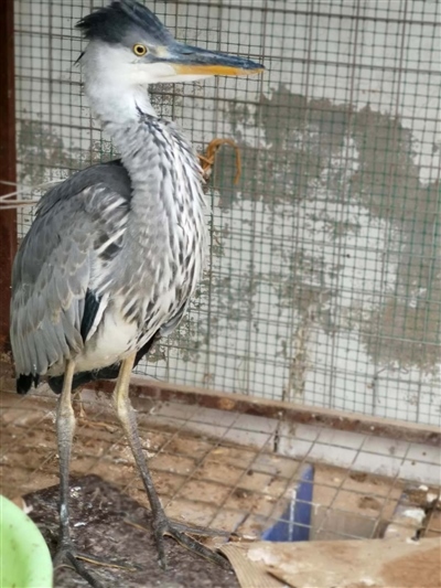 經(jīng)有經(jīng)驗的民警辨認,這是一只蒼鷺幼鳥。這只鳥身高約70公分,長長的尖嘴,身著灰色體羽,頭戴深灰色羽冠,兩條大長腿格外顯眼,白色的前頸縱向排列著黑灰色條紋。民警聯(lián)系獸醫(yī)為其做了體檢,經(jīng)檢查,這只鳥并無傷病,可能是由于剛出窩飛行能力不強、捕食能力不足,造成體力虛弱。民警買來小魚,只見這只鳥狼吞虎咽享用起來,不久便精神十足,開始啄民警??吹剿w力開始恢復,民警懸著的心也就放下了。民警計劃選擇合適時間和地方將其放飛。
