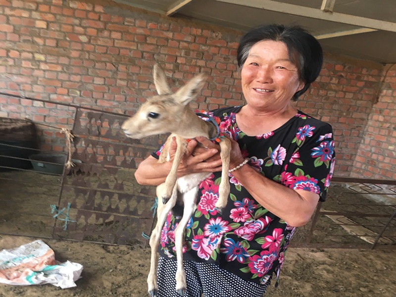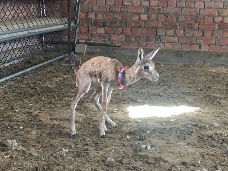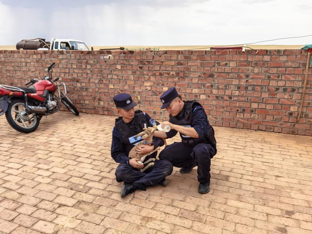 7月9日,甘其毛都邊境派出所民警與護邊員寶日夫在開展日常巡邊工作途中,發(fā)現(xiàn)一只受傷的黃羊幼崽伏在地上瑟瑟發(fā)抖。經(jīng)檢查,這只小黃羊年齡約為4個月,左后肢疑似扭傷,無法正常行走,身體也極為虛弱。民警立即將小黃羊帶到護邊員寶日夫家中包扎救治。寶日夫夫婦還為小黃羊做了一個項圈掛在脖子上,希望它盡快痊愈,茁壯成長。