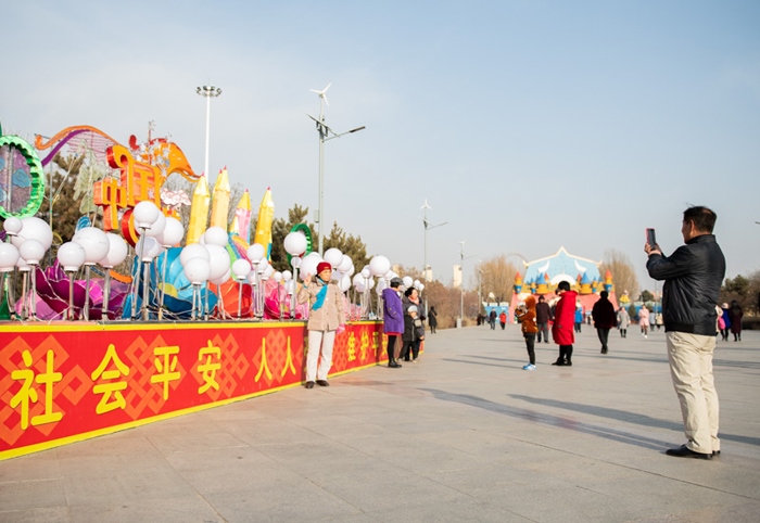 2月5日,在呼和浩特市阿爾泰游樂園,市民與春節(jié)元素的花燈合影留念。正月初一,人們來到年味十足的廣場(chǎng)、公園逛一逛,在花燈前合影留念,定格幸福瞬間。