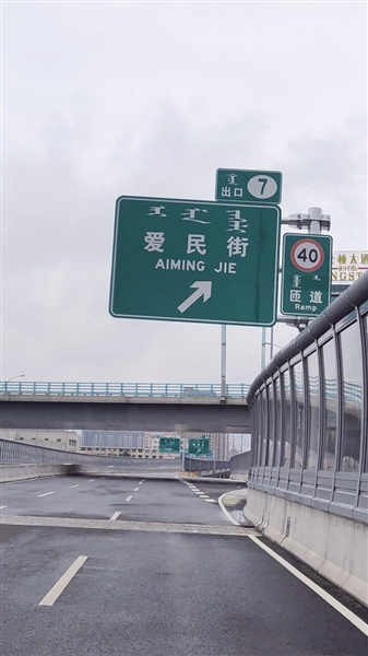 當日,記者駕車來到哲里木路高架橋,沿南向北方向行駛,看到沿路提示愛民街下行匝道口的路牌一共有4塊,每塊上都有中文和拼音,顯示為“愛民街”“AIMING JIE”。記者從愛民街下行匝道口到達愛民街與哲里木路輔路交會處,在東西方向的愛民街路口發(fā)現(xiàn)路牌名是由中文、蒙古文和拼音組成,其中拼音為“AIMIN JIE”。因呼市地區(qū)方言中,“MING”與“MIN”的發(fā)音不易分辨,這也是為什么網(wǎng)友在視頻中說用方言命名路名的原因。