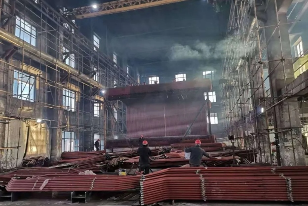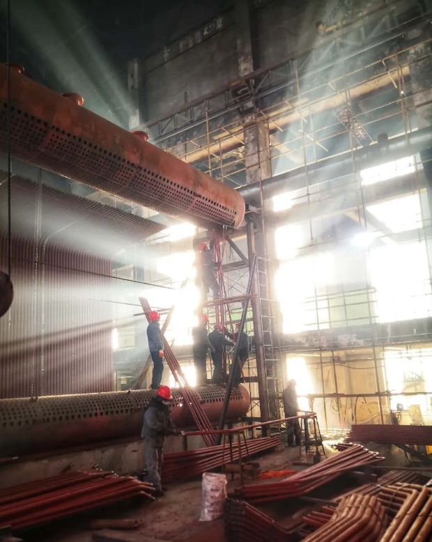 檢修工人正在鍋爐衛(wèi)燃帶處清除水冷壁管砌筑物