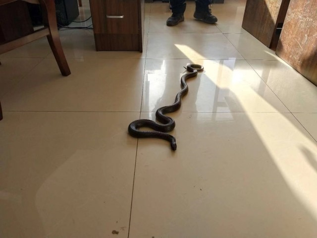 接到報警后,呼和浩特市玉泉區(qū)公安分局民警立即趕到現(xiàn)場,此時,匯豪天下小區(qū)的保安已將蛇抓捕,經(jīng)民警鑒定,這條大蛇為成年黑王錦蛇。民警看到,這條蛇非常溫順,并不害怕人,當(dāng)民警伸手去抓它時,這條蛇也并未作出攻擊的舉動。民警判斷,這條蛇很可能是人工飼養(yǎng)。