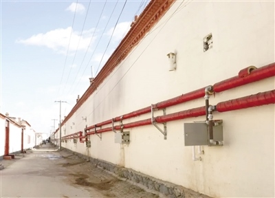 在臺閣牧鎮(zhèn)沙家營村,記者看到供熱管網(wǎng)改造施工時開挖的街巷已完成路面硬化;換熱站內(nèi)運轉的機器隆隆作響,輸送熱源的管道摸起來十分燙手;在成排的居民房屋后墻整齊地安裝了包裹保溫材料的供熱管道和計量表箱,暖氣經(jīng)由這些管道輸送到各家各戶。