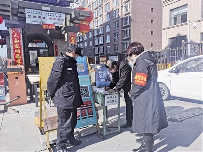 記者跟隨工作人員來(lái)到轄區(qū)地新街坊小區(qū),幾名社區(qū)工作人員正在小區(qū)門(mén)口負(fù)責(zé)疫情防控,“您好!請(qǐng)問(wèn)您去哪棟樓?請(qǐng)下車(chē)登記信息。謝謝!”“請(qǐng)居民佩戴好口罩”……針對(duì)出入小區(qū)的人員,社區(qū)工作人員都一一仔細(xì)核查,宣傳防疫信息。“春節(jié)長(zhǎng)假過(guò)后,很多事都堆到今天了,所以格外忙?!卑⒗票甭飞鐓^(qū)黨總支書(shū)記王海瓊說(shuō),阿拉善北路社區(qū)很多網(wǎng)格員都放棄了與家人團(tuán)聚的時(shí)間,主動(dòng)下沉到各個(gè)小區(qū)開(kāi)展疫情防控工作,實(shí)行24小時(shí)輪崗制,做好外地返呼人員登記和掃碼工作,保證轄區(qū)防控安全。除此之外,還積極參與禁燃煙花爆竹、垃圾分類(lèi)宣傳等工作,讓政策落到實(shí)處。