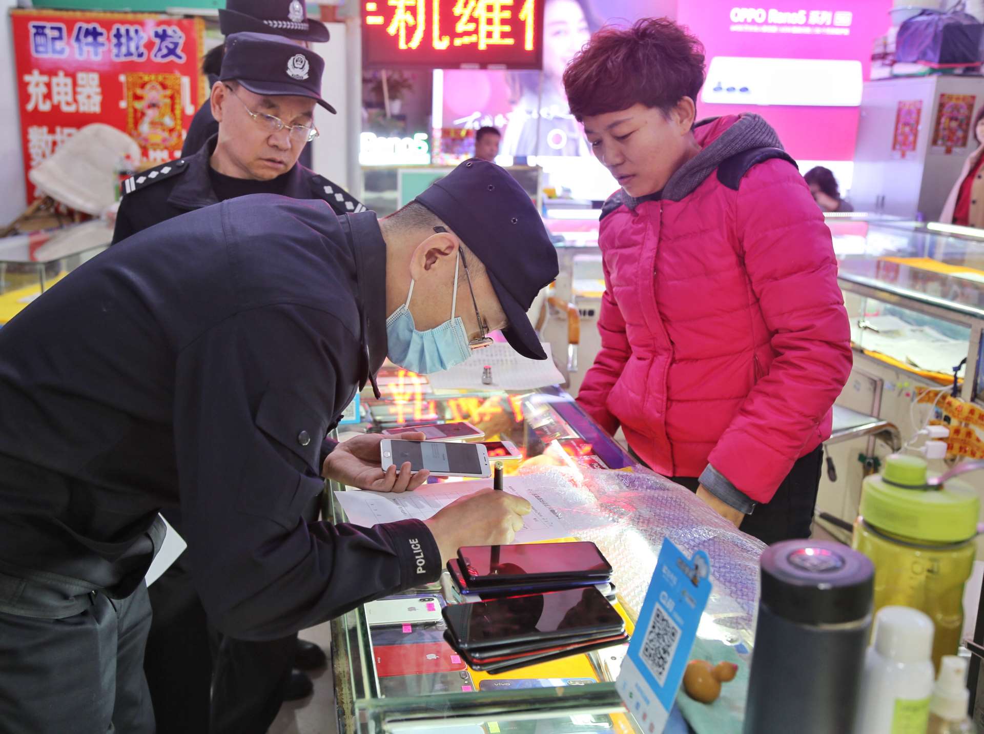 按照預(yù)定方案,行動分為四組,兩組對永和二手手機市場和眾興二手手機市場進行突擊清查,另兩組以便衣形式對周圍流動收售手機人員進行排查。行動期間,民警對二手手機銷售店鋪內(nèi)的手機和工作人員情況進行清查,逐一對照登記臺賬,嚴格檢查落實情況,同時向經(jīng)營業(yè)主及市民進行法制宣傳教育。此次行動共排查登記二手手機850部,買賣二手手機人員50余人,檢查二手手機商戶22家,暫扣未履行登記手機30余部。