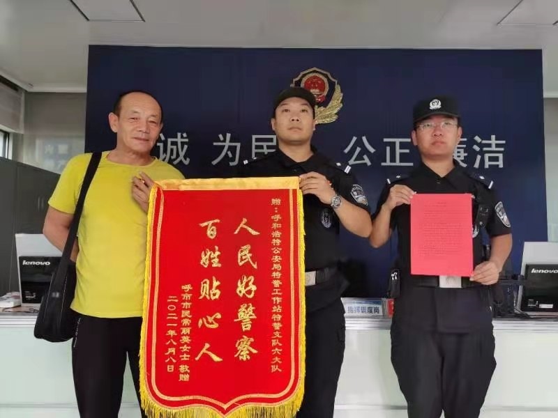 8月10日下午15時(shí),常麗英丈夫郝青山來(lái)到六大隊(duì)回民警務(wù)站,送來(lái)了一面錦旗和一封感謝信,對(duì)大隊(duì)民警提供的熱心救助表示感謝。
