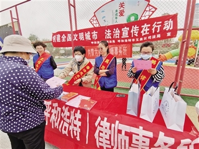 近日,玉泉區(qū)司法局西菜園司法所聯(lián)合正信公證處、祺翰律師事務(wù)所、鵬旭律師事務(wù)所、盛恒律師事務(wù)所在西苑家園小區(qū)廣場開展了創(chuàng)城法治宣傳活動。(記者 其布日哈斯 攝)