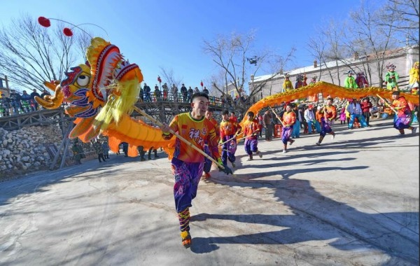 舞龍 1月13日,演員們?cè)诤艉秃铺厥谢孛駞^(qū)莫尼山非遺小鎮(zhèn)表演......
