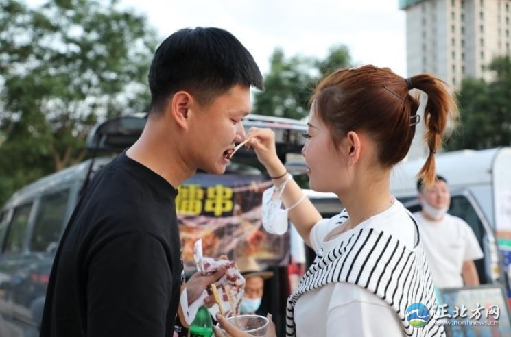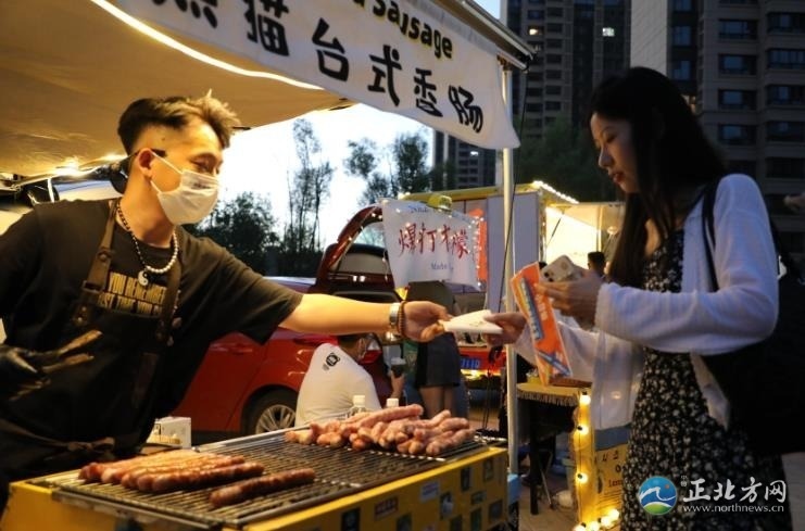 人間煙火氣,最撫凡人心。雖然已是21時(shí)許,但是后備廂集市依然人頭攢動(dòng),熱鬧非凡,叫賣聲不絕于耳。一家烤腸攤位前,攤主郭浩楠一邊招呼食客,一邊拿著夾子不緊不慢地翻動(dòng)著烤架上的烤腸,烤好后拿竹簽一穿,伴著滋滋作響的聲音,紅光透亮的烤腸瞬間香氣四溢?!耙呀?jīng)參加了好幾場(chǎng)了,一晚上能售出近百根烤腸,不過我的初衷不是為了賺錢,就是想把自己鐘情的美食分享給大家?!惫崎f。