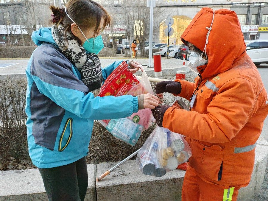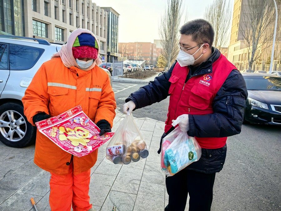 大家身穿志愿者馬甲,三五人一組結(jié)伴走上街頭,只要見到正在工作的環(huán)衛(wèi)工人,就會(huì)遞上一份節(jié)日暖心包,里面有臘八粥、小點(diǎn)心、春聯(lián)福字、兔年吉祥物裝飾卡片,還有酒精、口罩等防疫物資。