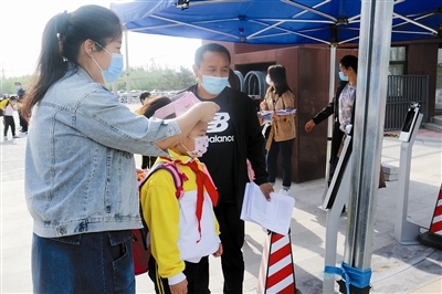 “等了這么久,終于可以和同學們說句:早上好?!?月2日,早上7點剛過,通遼新城第一中學小學部二年一班的班主任崔老師早早的在校門口,迎接班里的小朋友們。記者在校門口看到,此時,小學部二、三年級的小朋友已經(jīng)陸續(xù)入校了,顯然,“萌娃”們已經(jīng)被校門口的層層關(guān)卡震撼到了,幸好,在眾多老師的幫助和指引下順利進入了校門。進入了校門后,還有一道重要關(guān)卡,測量體溫,習慣了伸出手臂來測量體溫的“萌娃”們,對著紅外線測溫儀卻不知所措了,有的對著測溫儀伸出了手臂、有的對著測溫儀行禮,著實“萌”翻了現(xiàn)場所有人?!按蘩蠋煟覀兌枷肽懔?。”見到幾位小朋友要湊到跟前兒,崔老師立刻提醒同學們:我也很想念你們,但是我們要保持“一米”的距離,快去教室吧!小朋友們被“殘忍”拒絕,很是失落。