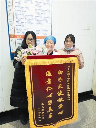 11月27日,當孩子已經好轉出院,王欣影沒有忘記那一夜遇到的好心人,她再一次撥通白楊的電話,此時,她才得知白楊就是附屬醫(yī)院手術室的一名護士。她將一面寫有“白衣天使獻愛心醫(yī)者仁心留美名”的錦旗送到了白楊的手中,她說:女兒又多了一位媽媽。白楊也向記者講起了那晚的經歷,她說:“其實,那晚我是去接我丈夫的,由于暴雪,丈夫被困在了米家科技園附近,我開車去接他,在回來的路上,看到有車輛遇險,心想,這樣惡劣的天氣,遇到誰有困難就應該幫一把,當時,我們也沒有多想,我也是做母親的,看到夫妻倆那么焦急,我只想把孩子快點送到醫(yī)院,好在有驚無險,孩子平安無事?!焙髞恚浾哌€了解到,當把孩子送到醫(yī)院后,白楊已渾身濕透,待孩子已經搶救上,安頓好王欣影后,已經是凌晨5點,天也蒙蒙亮了,白楊沒有回家,一夜未眠的她,留在了工作崗位上。