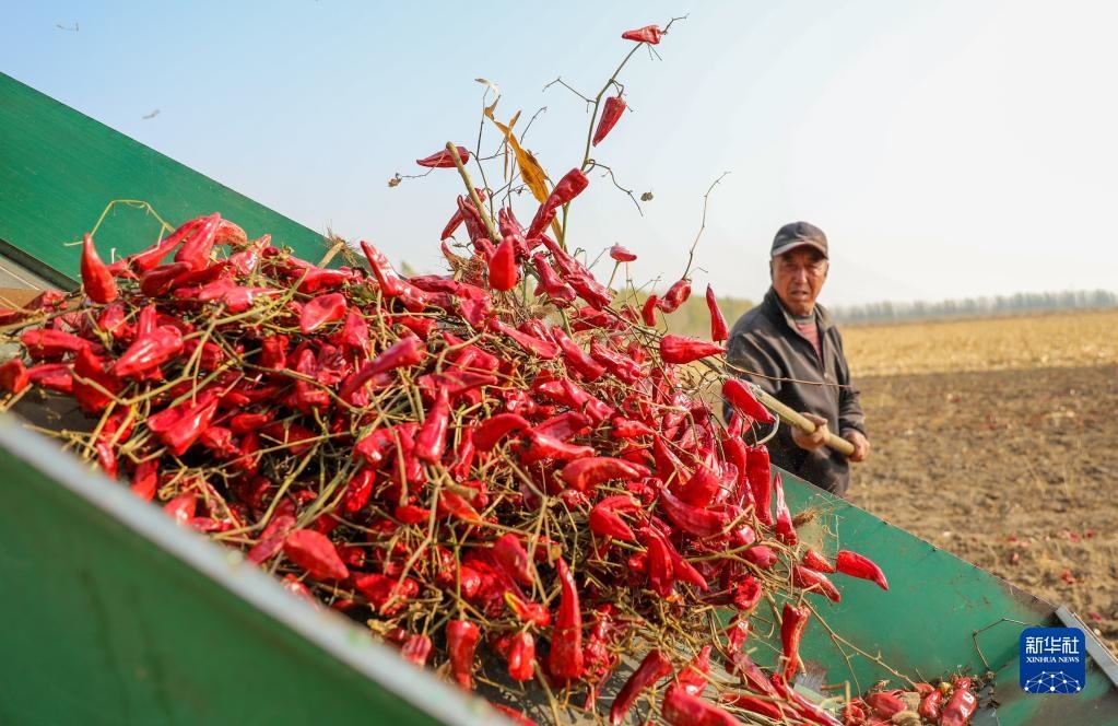 10月25日,在開魯縣東風(fēng)鎮(zhèn)東方紅村,村民在田間收獲紅干椒。新華社記者 連振 攝
