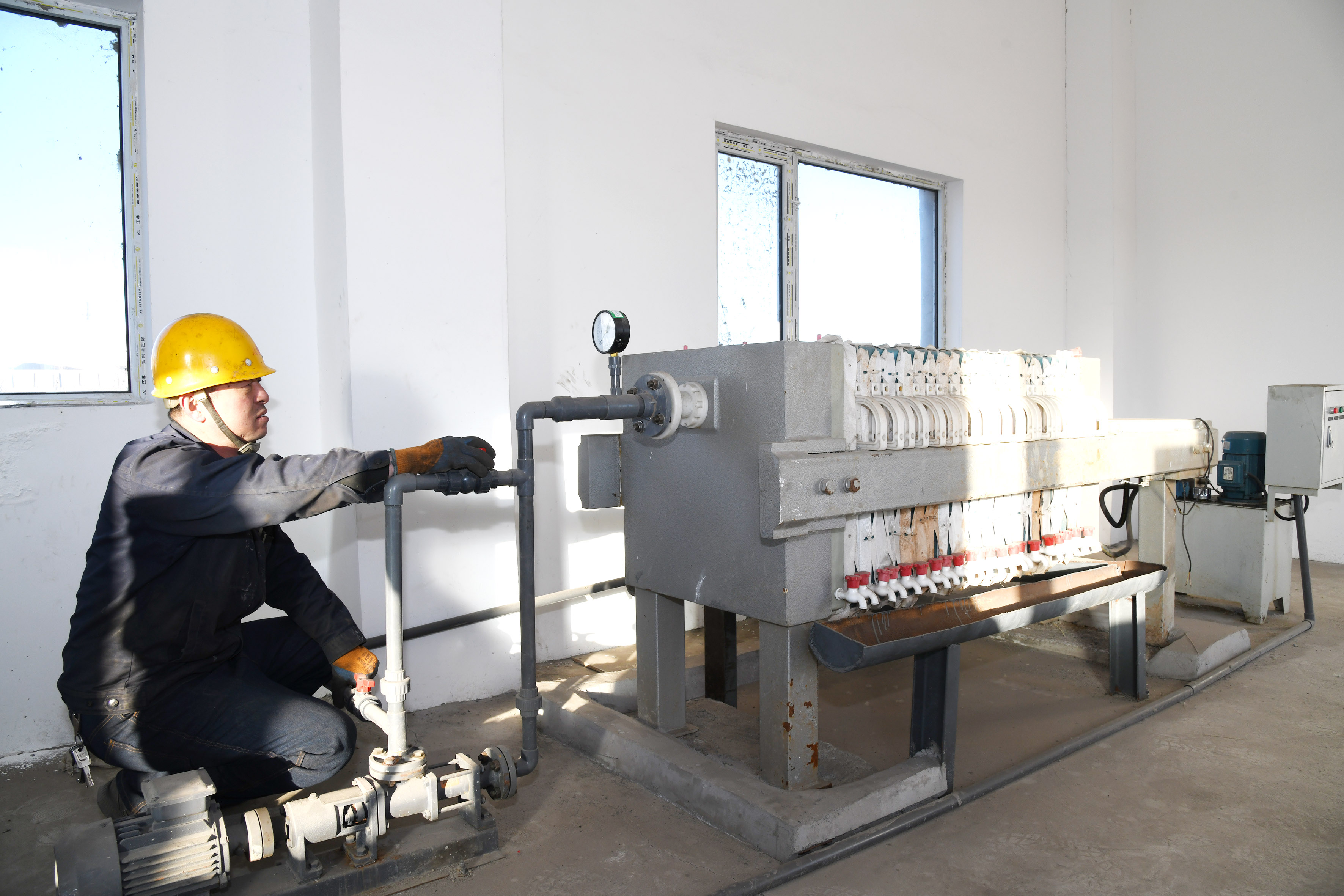 工業(yè)園區(qū)工作人員正在檢查污水處理設備部件。