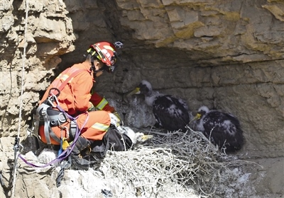 當(dāng)天7時左右,在烏海市海勃灣區(qū)甘德爾山景區(qū)半山腰處,攝影愛好者焦長青在拍攝時發(fā)現(xiàn)了一窩出生20多天的幼年野生黑鸛,其中一只黑鸛行動異常,疑似受傷。他立即撥打了119報警電話,同時聯(lián)系了烏海市野生動物保護(hù)部門。9時許,烏海市消防支援支隊光明路特勤站和烏海市野生動物保護(hù)部門的工作人員到達(dá)現(xiàn)場。經(jīng)勘查,在距離懸崖正下方大約30米處的巖洞內(nèi),一只幼年黑鸛被尼龍繩纏繞住腿部而受傷,不能行動。消防員隨后尋找合適的位置制作錨點。消防員陳意攜帶救援裝備速降到懸崖下方展開營救,一個小時之后,受傷的幼年黑鸛被成功救出,并送往海勃灣區(qū)林業(yè)草原局救助站進(jìn)行救治。