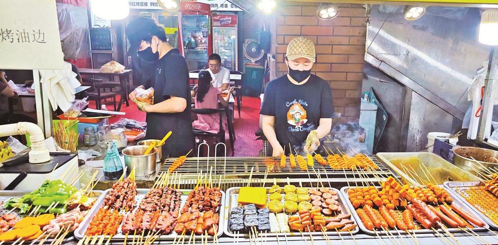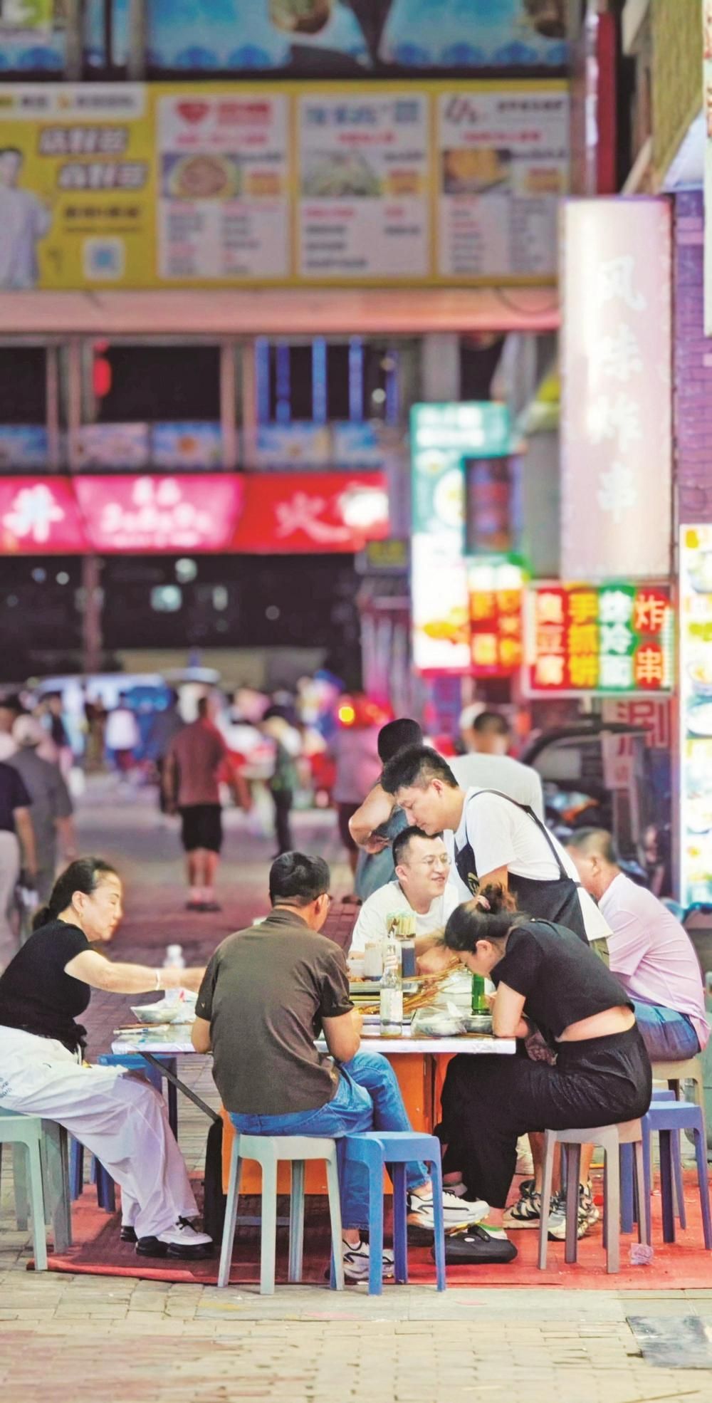 炭火上的羊肉串嗞嗞作響,油脂滴落,迸出金色火花,散發(fā)出誘人的香氣??腿藝谒芰闲∽琅?,手里拿著冰鎮(zhèn)啤酒,碰杯傳出清脆的響聲……這里沒(méi)有高檔餐廳的拘謹(jǐn),只有朋友相聚的歡樂(lè)和大口吃肉的暢快。大學(xué)生徐瑞虹放暑假后,經(jīng)常和朋友來(lái)夜市消暑?!拔覀儙讉€(gè)沒(méi)事就來(lái)萬(wàn)達(dá)金街轉(zhuǎn)一轉(zhuǎn),天太熱了,待在家里也悶,而且夜市里的這些小吃我們都比較喜歡,沒(méi)事幾個(gè)人喝幾瓶啤酒,聊一聊天,感覺(jué)還是很愜意的?!睂?duì)于年輕人來(lái)說(shuō),夜市不僅是美食的聚集地,更是釋放壓力、享受生活的好去處。在這里,他們可以暫時(shí)拋開(kāi)煩惱,盡情享受美食帶來(lái)的快樂(lè)。