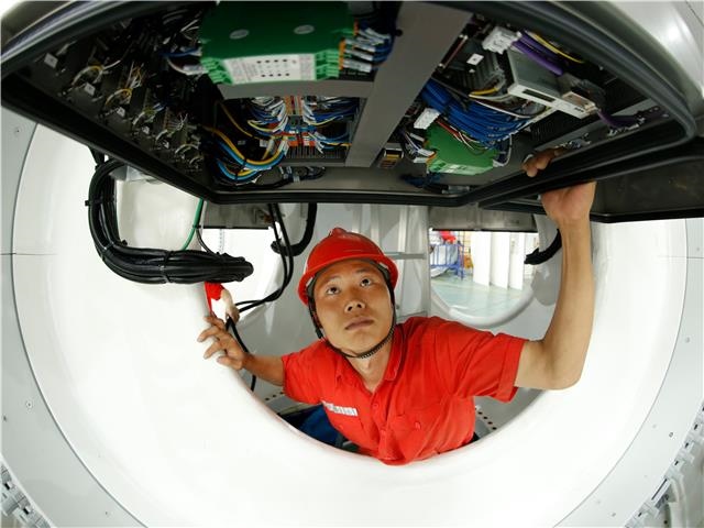 金風(fēng)科技公司工人在安裝風(fēng)機(jī)主機(jī)。金泉攝