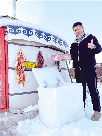 12月8日,記者幾經(jīng)周折與視頻中的小伙張智磊取得了聯(lián)系。張智磊今年36歲,從小在錫林郭勒大草原長(zhǎng)大,在當(dāng)?shù)刂饕雠Q蛉馍?。?duì)于意外走紅,張智磊直言自己也沒有想到?!耙曨l是在錫林浩特市南郊向陽村叔叔家院子里的蒙古包拍攝的。記得小時(shí)候,每到冬天,周邊牧民都是把食物埋在雪地里儲(chǔ)存。我前幾天也拍了一個(gè)從雪地里找羊腿的視頻,有粉絲留言‘放在雪地里會(huì)不會(huì)忘記位置容易丟了’,然后我就突發(fā)奇想,干脆做個(gè)‘冰箱’把年貨放進(jìn)去?!睆堉抢诟嬖V記者,他從12月3日開始凍冰塊,12月4日把凍結(jié)實(shí)的冰塊拿出來用冷水黏合,因?yàn)楸鶋K低于0攝氏度,遇水就會(huì)瞬間黏在一起,然后開始著手打磨,棱棱角角都用電熨斗熨平整,再加上蓋,一個(gè)“冰箱”就完成了。