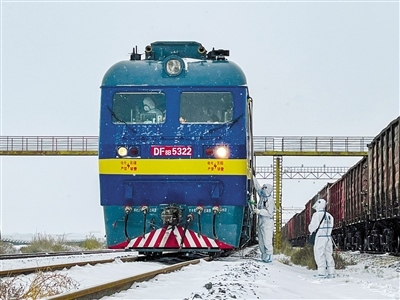 11月6日,二連出入境邊防檢查站執(zhí)勤民警頂風冒雪,對通關列車進行檢查驗放。日前,二連浩特市出現(xiàn)降雪、強降溫天氣,最低溫度降至零下15℃。二連出入境邊防檢查站民警積極做好惡劣天氣下疫情防控、通關服務保障工作,全力保障口岸通關安全順暢。(記者 安寅東 攝)