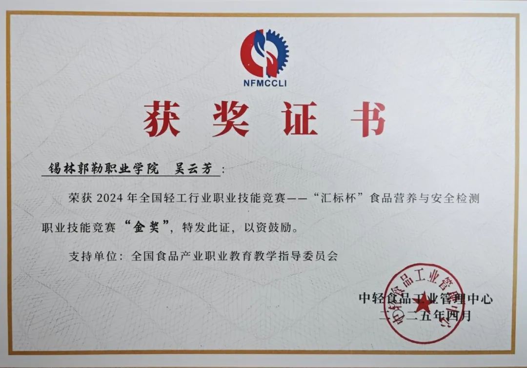 2025年4月21日,由中國輕工業(yè)聯(lián)合會、中輕食品工業(yè)管理中心、全國食品產(chǎn)業(yè)職業(yè)教育教學(xué)指導(dǎo)委員會等聯(lián)合舉辦的2024年全國輕工行業(yè)職業(yè)技能競賽——“匯標(biāo)杯”食品營養(yǎng)與安全檢測職業(yè)技能競賽總決賽在廣州圓滿落幕。錫林郭勒職業(yè)學(xué)院食品檢測中心總工程師吳云芳同志榮獲金獎。