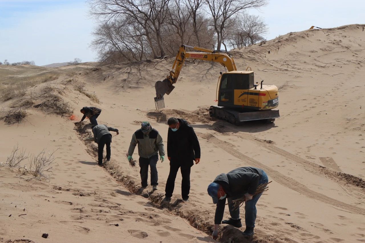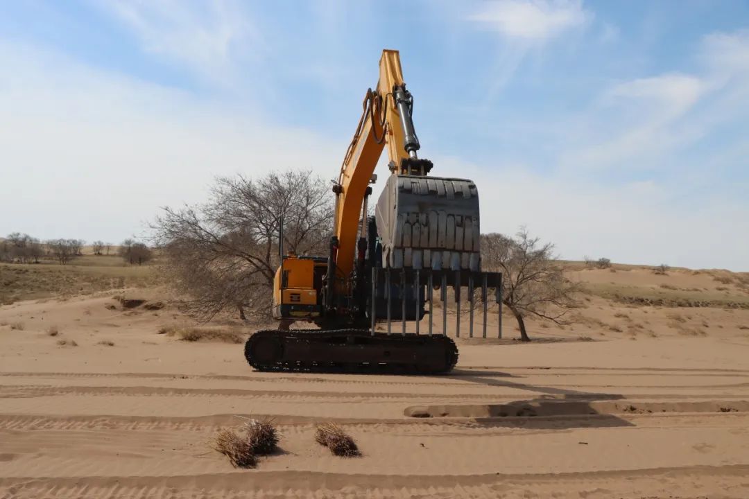 據(jù)錫林浩特市二蛋牧民養(yǎng)殖專業(yè)合作社負責(zé)人介紹,在傳統(tǒng)的沙漠治理作業(yè)中,工人需要手動栽植黃柳等固沙植物。然而,人工種植不僅效率低,勞動強度也大。為突破這一困境,合作社成員經(jīng)過多次試驗,最終決定對挖掘機進行創(chuàng)新改造,加裝叉具,這一巧妙的設(shè)計不僅實現(xiàn)了對黃柳種植深度和間距的精準(zhǔn)把控,還能有效避免土壤翻動,最大程度地保持了土壤水分,切實保護了沙地的生態(tài)環(huán)境。