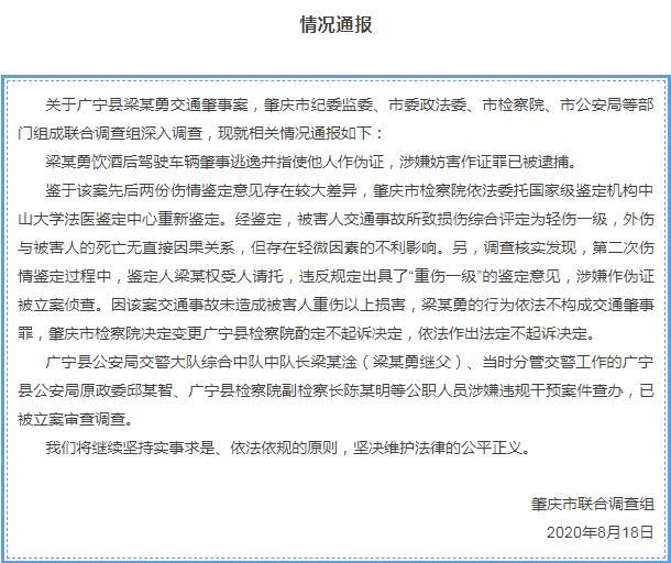 廣寧縣公安局交警大隊綜合中隊中隊長梁某淦(梁某勇繼父)、當時分管交警工作的廣寧縣公安局原政委邱某智、廣寧縣檢察院副檢察長陳某明等公職人員涉嫌違規(guī)干預案件查辦,已被立案審查調查。