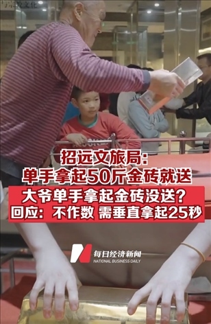 ·山東煙臺(tái)招遠(yuǎn)文旅局:單手拿起50斤金磚就送!大爺單手舉起50斤金磚沒拿走?回應(yīng):不作數(shù),需垂直拿起25秒。