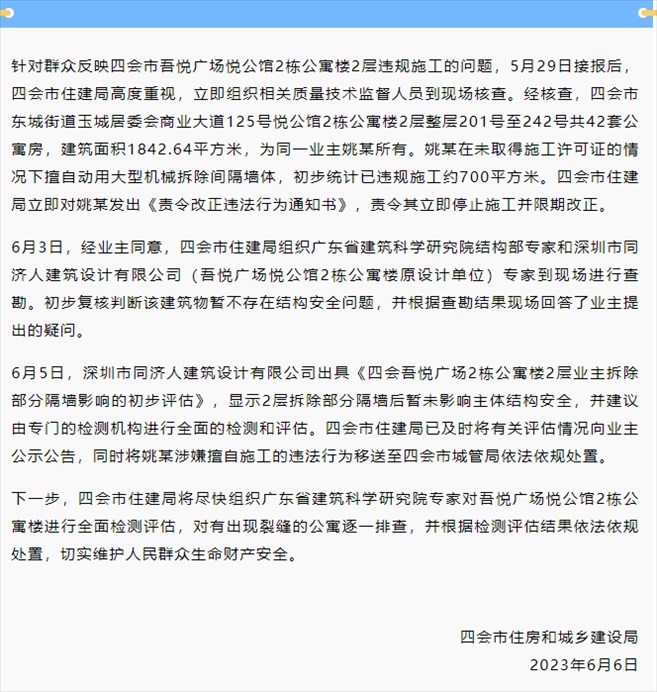 ·業(yè)主買(mǎi)42套房欲打通全部墻體,當(dāng)?shù)赝▓?bào):責(zé)令其立即停止施工并限期改正。