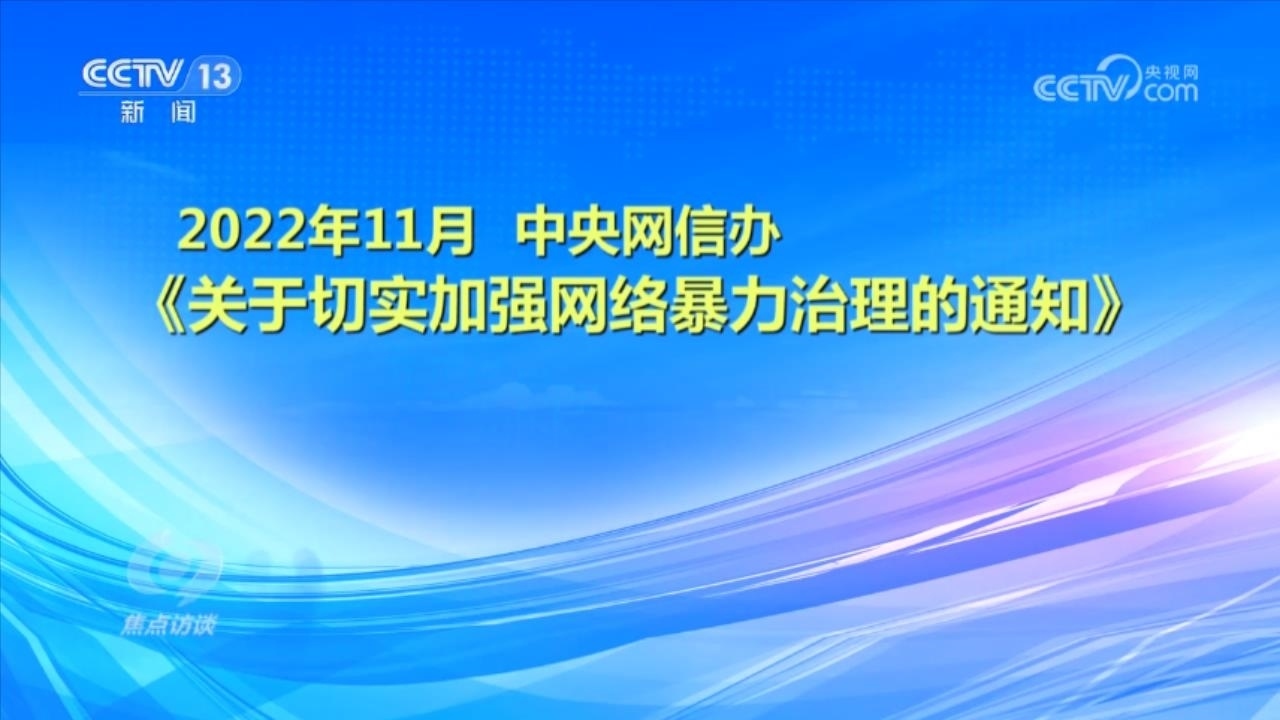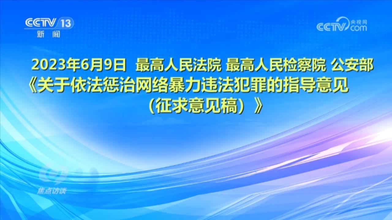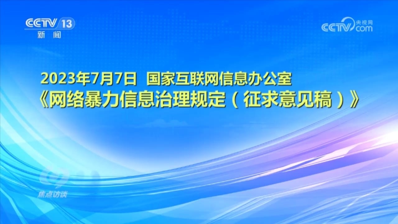 央視網(wǎng)消息(焦點訪談):俗話說“舌上有龍泉,殺人不見血”。網(wǎng)絡暴力不同于現(xiàn)實中的拳腳相加,但是這些在網(wǎng)絡空間中用文字、圖片等方式進行的傷害和侮辱,一樣可以對當事人的現(xiàn)實生活產(chǎn)生惡劣的影響,讓當事人的心靈“流血”。在傷害當事人的同時,網(wǎng)絡暴力行為也嚴重污染了互聯(lián)網(wǎng)環(huán)境,影響社會和諧穩(wěn)定。近日,國家互聯(lián)網(wǎng)信息辦公室起草了《網(wǎng)絡暴力信息治理規(guī)定(征求意見稿)》,向社會公開征求意見;同樣是針對網(wǎng)絡暴力,在6月,最高人民法院、最高人民檢察院、公安部起草了《關于依法懲治網(wǎng)絡暴力違法犯罪的指導意見(征求意見稿)》,面向社會公開征求意見。治理網(wǎng)絡暴力這顆“毒瘤”,營造良好生態(tài)勢在必行。