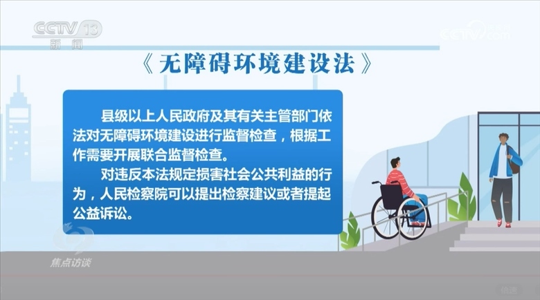 有了設(shè)施建設(shè)標(biāo)準(zhǔn)、劃分了管理維護責(zé)任,這還不夠,沒有監(jiān)督,無障礙環(huán)境建設(shè)工作很難持久。在《無障礙環(huán)境建設(shè)法》中,還對“如何保障‘急難愁盼’問題得到解決”進行了規(guī)定。比如縣級以上人民政府及其有關(guān)主管部門依法對無障礙環(huán)境建設(shè)進行監(jiān)督檢查,根據(jù)工作需要開展聯(lián)合監(jiān)督檢查。對違反《無障礙環(huán)境建設(shè)法》規(guī)定損害社會公共利益的行為,人民檢察院可以提出檢察建議或者提起公益訴訟。