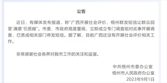 ·網(wǎng)傳廣西開展社會評價,梧州群發(fā)短信讓群眾回答“滿意”,梧州市政府:開展調查,已責成相關部門停發(fā)短信。據(jù)了解廣西還未開展社會評價相關工作。