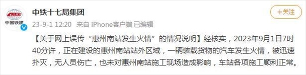 ·中鐵十七局集團發(fā)布對“惠州南站發(fā)生火情”的說明:一輛裝載貨物的汽車發(fā)生火情,被迅速撲滅,未造成人員、財產傷亡。
