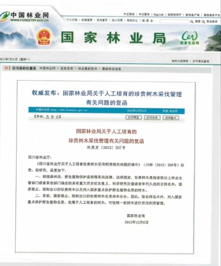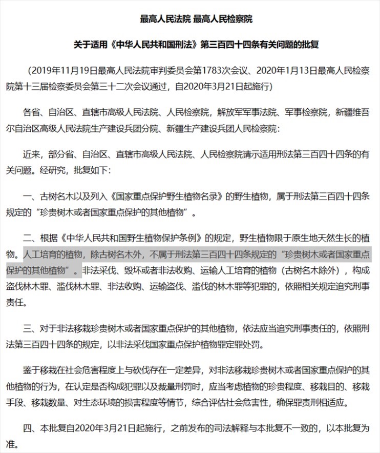 2020年3月,兩高批復(fù)明確“人工培育的植物,除古樹(shù)名木外,不屬于刑法第三百四十四條規(guī)定的‘珍貴樹(shù)木或者國(guó)家重點(diǎn)保護(hù)的其他植物’”。圖片來(lái)源/網(wǎng)頁(yè)截屏