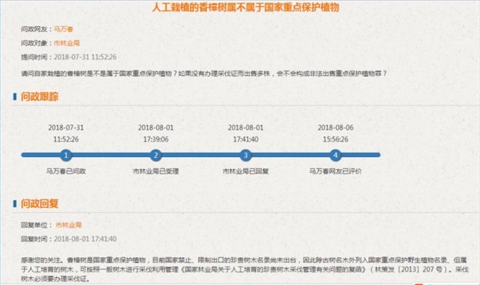 2018年7月,馬萬(wàn)春通過(guò)網(wǎng)絡(luò)問(wèn)政,得到的瀘州市林業(yè)局的答復(fù)。圖片來(lái)源/受訪者供圖