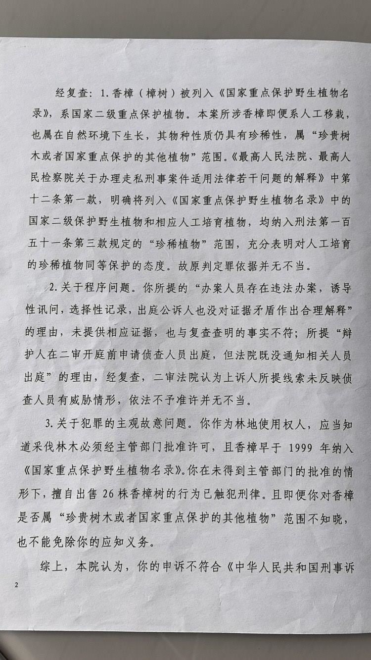 “都是人工種植的香樟樹(shù),瀘州中院為何在此案件中就認(rèn)定為國(guó)家重點(diǎn)保護(hù)植物,在同類(lèi)其他案件中就不認(rèn)定呢?”12月26日下午,馬萬(wàn)春告訴上游新聞?dòng)浾?,他在此前一審二審?dān)任哥哥的辯護(hù)人時(shí),搜集了許多案例試圖證明哥哥無(wú)罪,但他明顯感到自己的辯護(hù)意見(jiàn)沒(méi)有獲得法官認(rèn)同。更讓他無(wú)法理解的是:同一家法院在四年不到的時(shí)間里,針對(duì)類(lèi)似案件,判決結(jié)果竟然差距巨大。