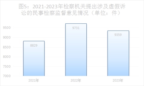 2023年,全國檢察機(jī)關(guān)提出涉及虛假訴訟的民事檢察監(jiān)督意見9359件,2021年、2022年分別為8829件、9731件,近三年始終保持高位。從監(jiān)督類型看,針對民事生效裁判監(jiān)督案件提出抗訴1366件,法院再審判決1418件(含積存),其中再審改變1377件,抗訴采納率97.1%;提出再審檢察建議5611件,法院裁定再審5580件,再審檢察建議采納率99.4%。針對民事審判活動(dòng)違法提出檢察建議1334件,針對民事執(zhí)行活動(dòng)違法提出檢察建議1048件,民事審判、執(zhí)行檢察建議采納率均達(dá)到100%,涉虛假訴訟監(jiān)督意見質(zhì)量總體較高。
