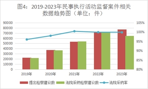 民事執(zhí)行活動(dòng)監(jiān)督辦案效率高,檢察建議采納率保持高位。2023年,全國檢察機(jī)關(guān)共受理民事執(zhí)行活動(dòng)監(jiān)督案件7.73萬件,審結(jié)7.72萬件。提出檢察建議6.49萬件,占審結(jié)案件的84%,同比持平。對提出的檢察建議,被監(jiān)督單位同期采納6.48萬件,民事執(zhí)行監(jiān)督檢察建議采納率達(dá)99%。