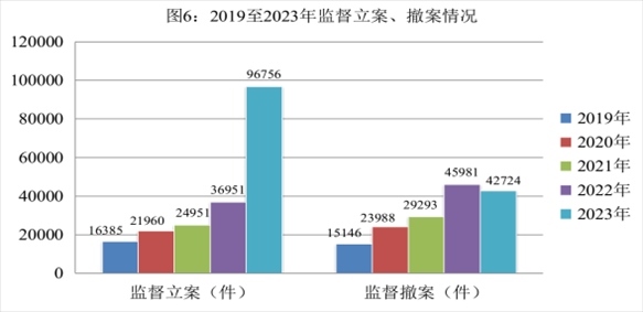 全國檢察機(jī)關(guān)共監(jiān)督立案96756件,同比上升1.6倍。監(jiān)督立案后起訴29974人,同比上升89.7%。作出生效裁判25693人,同比上升82.7%,其中,判處有期徒刑以上刑罰25259人,判處有期徒刑以上刑罰率98.3%,同比增加0.9個百分點(diǎn)。監(jiān)督撤案42724件,監(jiān)督撤案率100%,同比增加0.1個百分點(diǎn),呈逐年上升趨勢。