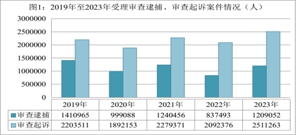 隨著新冠疫情防控轉(zhuǎn)段,我國經(jīng)濟(jì)回升向好,社會活躍度增加,同時,檢察機(jī)關(guān)與有關(guān)部門一道依法從嚴(yán)懲處電信網(wǎng)絡(luò)詐騙等嚴(yán)重影響人民群眾安全感的犯罪,刑事犯罪案件總量增長。2023年,全國檢察機(jī)關(guān)受理審查逮捕各類犯罪828999件1209052人,同比分別上升49.8%、44.4%。審查后共批準(zhǔn)逮捕72.6萬人,同比上升47.1%;受理審查起訴各類犯罪1786635件2511263人,同比分別上升19.7%、20%。審查后決定起訴168.8萬人,同比上升17.3%。