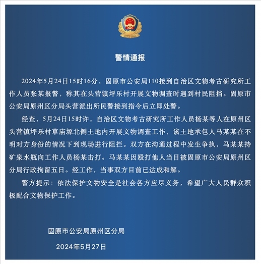 經(jīng)查,5月24日15時(shí)許,自治區(qū)文物考古研究所工作人員楊某等人在原州區(qū)頭營(yíng)鎮(zhèn)坪樂(lè)村草廟塬北側(cè)土地內(nèi)開(kāi)展文物調(diào)查工作,該土地承包人馬某某在不明對(duì)方身份的情況下到現(xiàn)場(chǎng)進(jìn)行阻攔。雙方在溝通過(guò)程中發(fā)生爭(zhēng)執(zhí),馬某某持礦泉水瓶向工作人員楊某擊打。馬某某因毆打他人當(dāng)日被固原市公安局原州區(qū)分局行政拘留五日。經(jīng)工作,當(dāng)事雙方目前已達(dá)成和解。