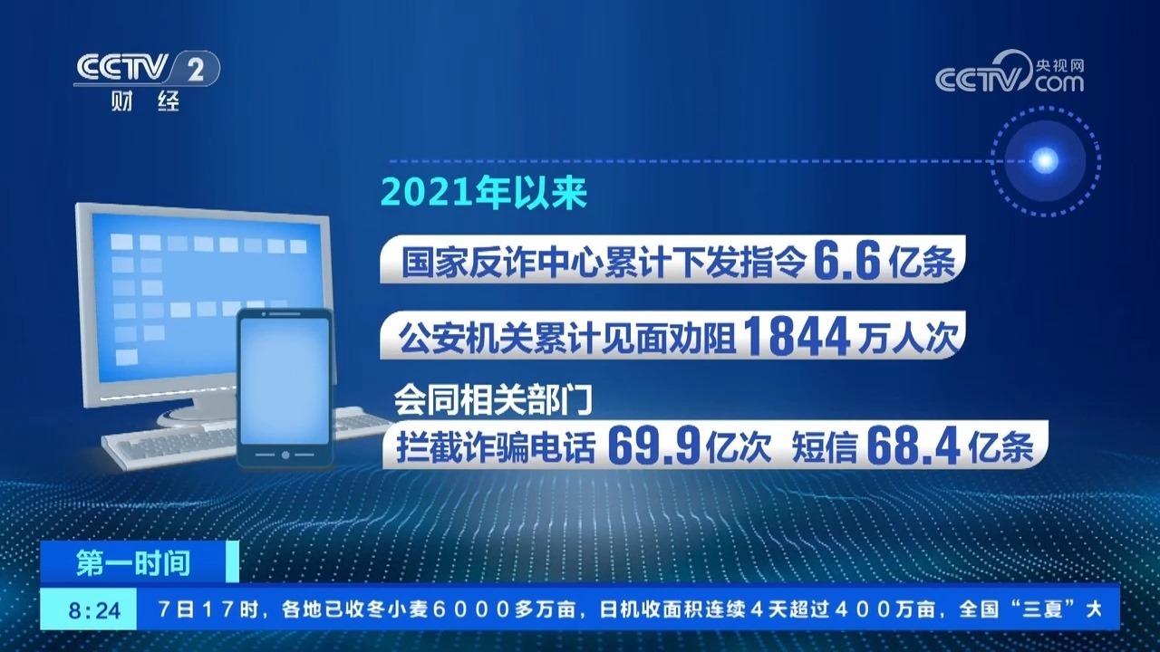 公安機關持續(xù)推進預警勸阻和技術反制工作。2021年以來,國家反詐中心累計下發(fā)指令6.6億條,公安機關累計見面勸阻1844萬人次,會同相關部門攔截詐騙電話69.9億次、短信68.4億條,處置涉案域名網址1800萬個,緊急攔截涉案資金1.1萬億元。