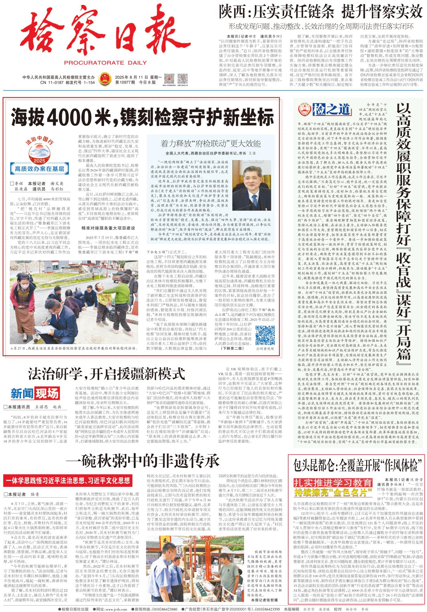 2025年8月11日,《檢察日報(bào)》第1版刊發(fā)題為《包頭昆都侖:全覆蓋開展“作風(fēng)體檢”》的文章,報(bào)道了內(nèi)蒙古自治區(qū)包頭市昆都侖區(qū)檢察院召開了一場“用身邊事教育身邊人”警示教育大會。這是該院今年以來以抓鐵有痕的勁頭推進(jìn)作風(fēng)建設(shè)的生動縮影。