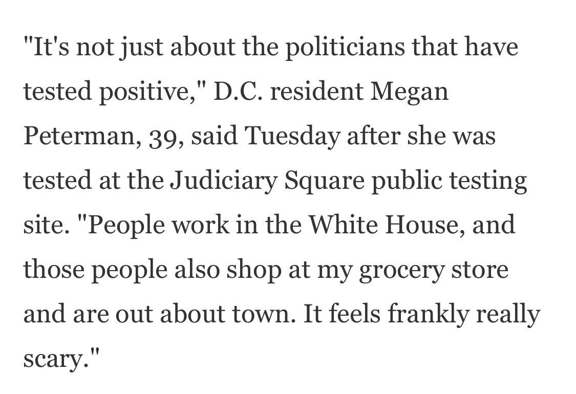 華盛頓居民梅根·彼得曼在當?shù)貢r間6日做了核酸檢測,她說:“最近許多白宮官員確診新冠肺炎,白宮工作人員也可能來過我的商店購物,說實話挺嚇人的。”