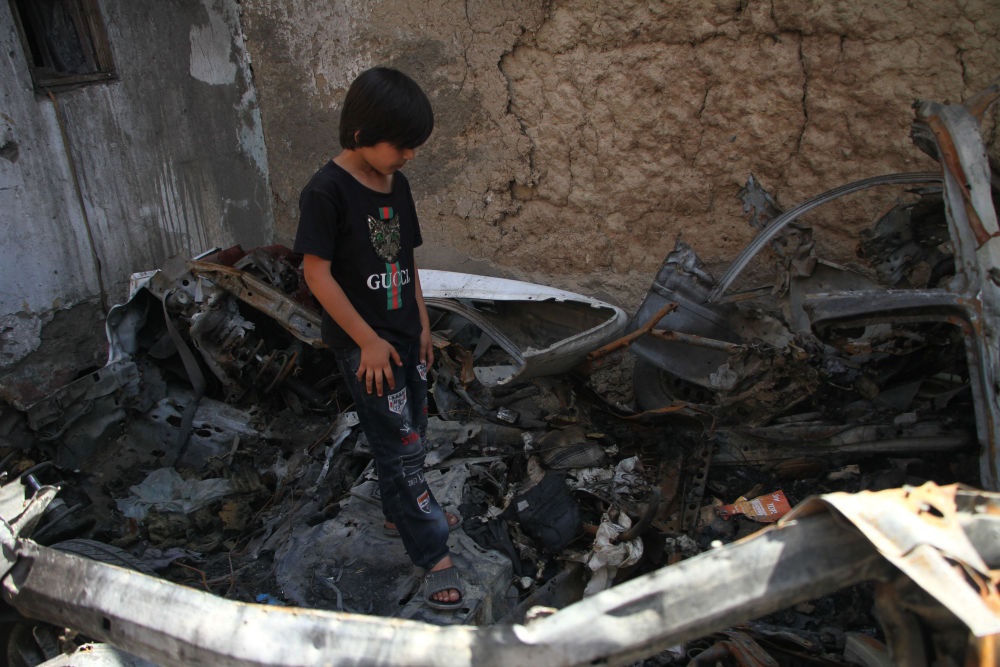9月18日,在8月29日被美軍無人機(jī)襲擊的阿富汗喀布爾居民區(qū),遇難者親人站在汽車殘骸上。新華社發(fā)(塞夫拉赫曼·薩菲攝)