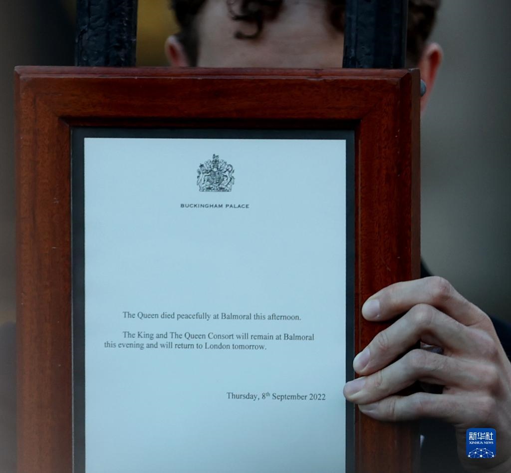 9月8日,在英國(guó)倫敦,工作人員將英國(guó)女王伊麗莎白二世去世的告示安放在白金漢宮大門(mén)上。新華社記者李穎攝
