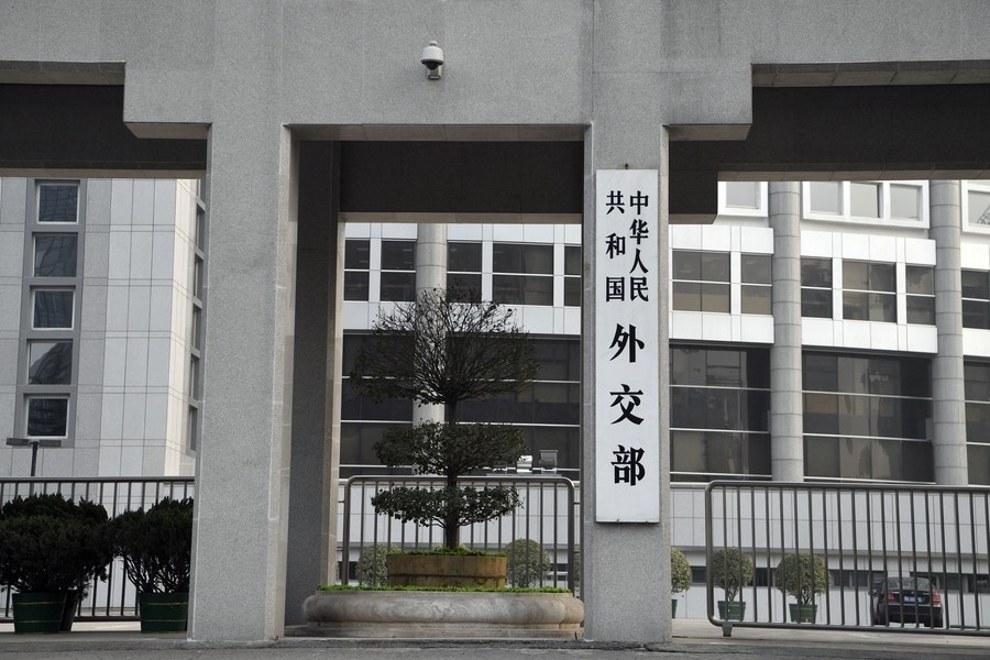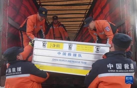 2月16日,在土耳其哈塔伊省安塔基亞市,中國救援隊隊員搬運(yùn)設(shè)備。
