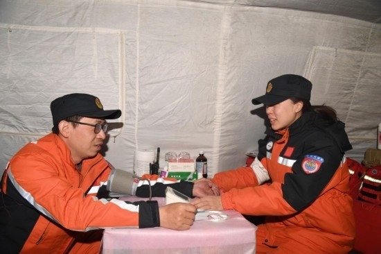 2月13日,在位于土耳其哈塔伊省哈塔伊體育館外的中國(guó)救援隊(duì)營(yíng)地,醫(yī)生為救援隊(duì)成員檢查身體。