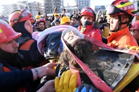 2月12日,在土耳其哈塔伊省安塔基亞市,中國(guó)救援隊(duì)轉(zhuǎn)移一名救出的幸存者。