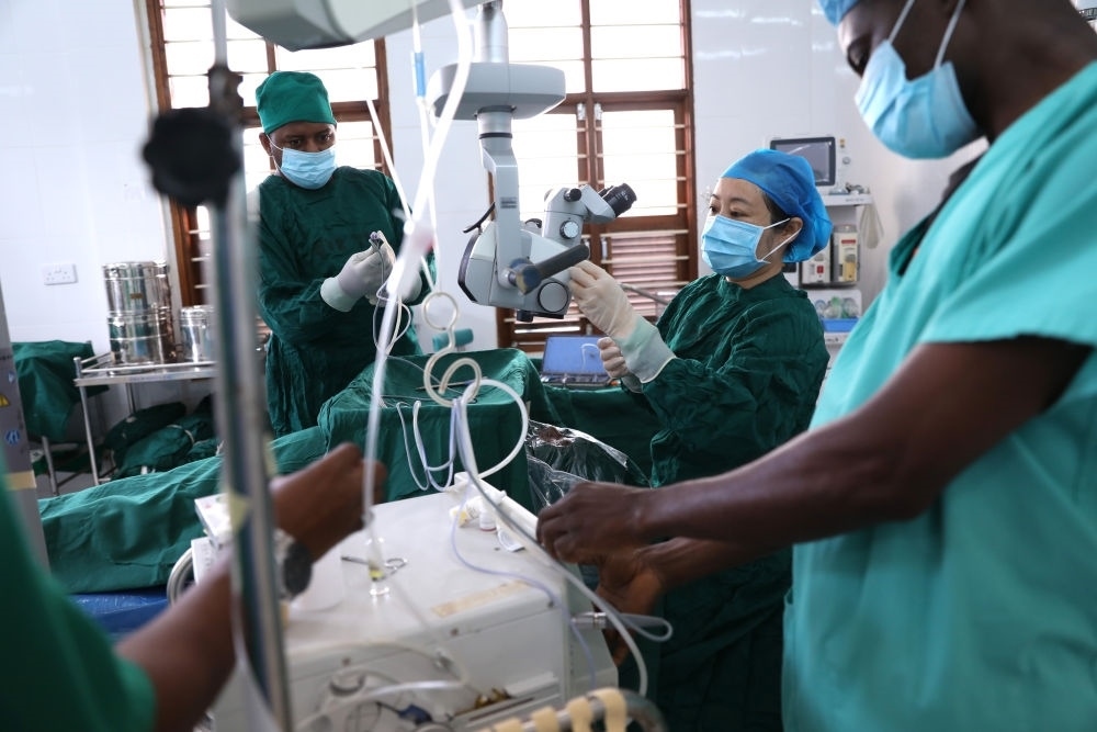 2023年2月23日,在坦桑尼亞桑給巴爾島納茲莫加醫(yī)院,第32期中國(guó)援桑給巴爾醫(yī)療隊(duì)的眼科醫(yī)生董莉莉(右二)與桑給巴爾同事一起做術(shù)前準(zhǔn)備。新華社記者 董江輝 攝
